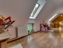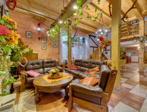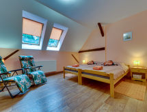 Objektnummer9-room house 380 m2 on 2 levels. Partly with sloping ceilings, comfortable and cosy furnishings: large entrance hall 25 m2. Open lounge 50 m2 with panoramic window with open-hearth fireplace. Open playroom 25 m2 with bar. 1 large room 40 m2 with 1 double bed and shower/WC. Exit to the garden, to the terrace. Open kitchen 35 m2 (8 hot plates, oven, dishwasher, microwave, electric coffee machine, steamer). 2 sep. WC's. Upper floor: open gallery 40 m2, with sloping ceilings with library, flat screen and radio. 2 rooms 18 m2, with sloping ceilings, each room with 2 beds (90 cm, length 200 cm), shower/WC. 1 room 18 m2, with sloping ceilings with 2 beds and bath/bidet/WC. 1 room 18 m2 with 2 beds (90 cm, length 200 cm), shower/bidet/WC and TV. Beautiful view of the garden and the countryside. Facilities: safe, mosquito net, baby cot for up to 3 year olds. Parking at the house. Please note: suitable for families. Non-smoking house. Maximum 2 pets/ dogs allowed. Separate entrance to the bedroom on the ground floor, wheelchair-user-friendly. TV for independent Polish and German programs in individual rooms. Instead of an enclosed bedroom, some sleeping areas are located in an open-plan area (gallery, alcove, etc.). #209147242