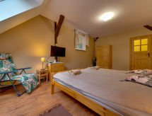 Beautiful, rustic single-family house Gościniec Pod Dwoma Sercami, built in 1930, renovated in 2006, surrounded by trees and meadows. On the outskirts, in a quiet, sunny position, 5 km from the lake, in the countryside, in the woods. For shared use: property 1 ha (fenced), well-kept garden plants and trees, meadow 4'000 m2 (fenced), pond, swimming pool (above ground) round (5 m diameter, seasonal availability: 01.Jun. - 15.Sep.). Patio (28 m2), garden furniture, barbecue (swing). In the house: table football, central heating system. Breakfast full board half board possible on request (extra). Parking (for 5 cars) on the premises. Shop 5 km, supermarket 5 km, bus stop 1 km, railway station 5 km, sandy beach 5 km, outdoor swimming pool 1.5 km, bathing lake 5 km. Riding stable 1.5 km. Please note: fishing [permit required]. The owner lives on the same property. Pool for bathing in the forest, approx. 1.5 km away (surface area 3 ha). A beautiful terrace pier over the pond. Riding, 1.5 km away. Fishpond (trout, tench, carp) - extra, 3 km. Complex with 20 ponds for fish-breeding (no fishing), 500 m. On request, after prior arrangement, catering: breakfast, lunch, dinner or any meal of your choice - prices, depending on the menu, are set by the meal supplier. Catering should be paid immediately after receiving the meals. Note: Youth groups are accepted only after obtaining the consent of the owner, in this case the deposit is increased to 1000 PLN.